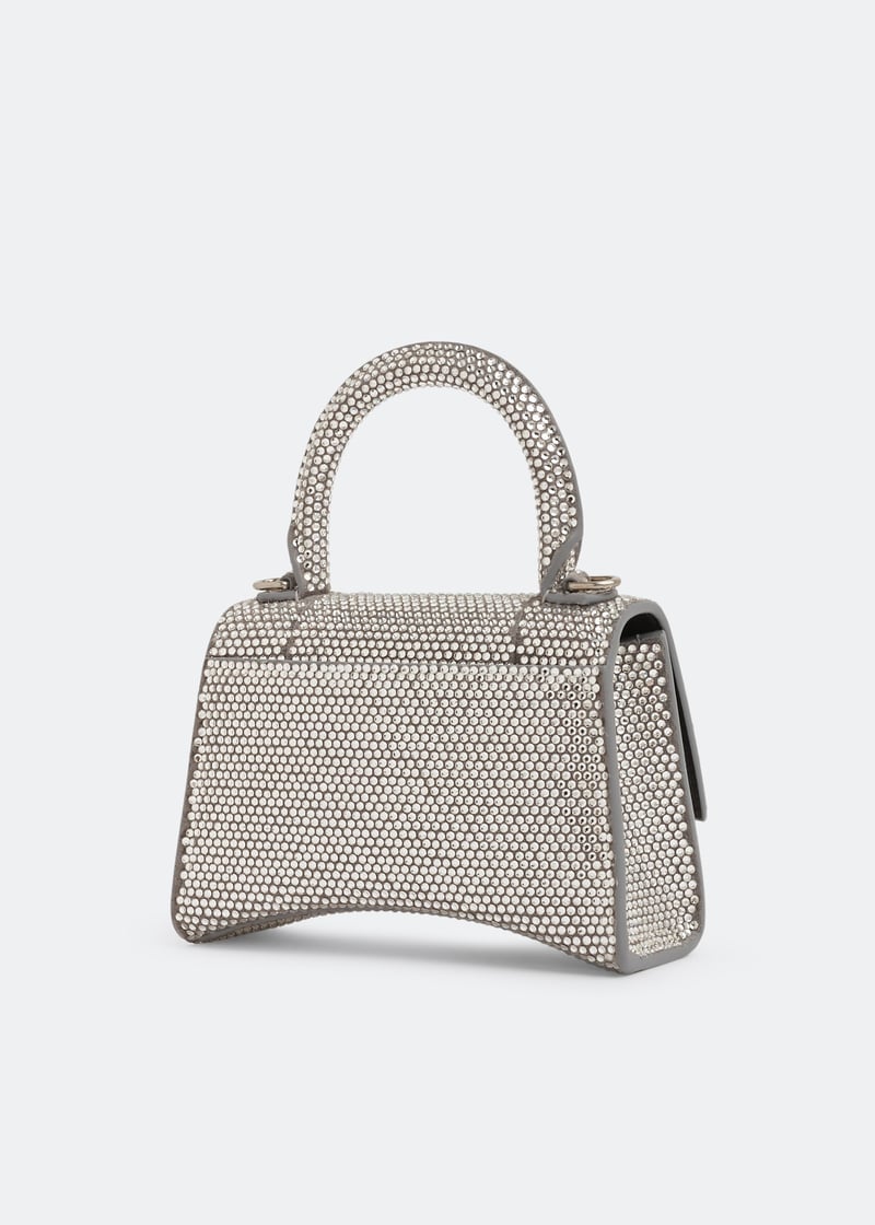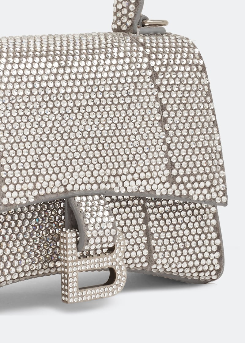 The crescent curved base of the Hourglass mini chain bag pays a tribute to founder Cristobal Balenciaga's signature Basque-waist coats. It's crafted in Italy from suede calfskin with a rhinestone-embellished upper and B logo hardware. Carry it by the top handle or go hands-free with the chain strap. Bag measures approximately 19cm x 13cm x 8cm.