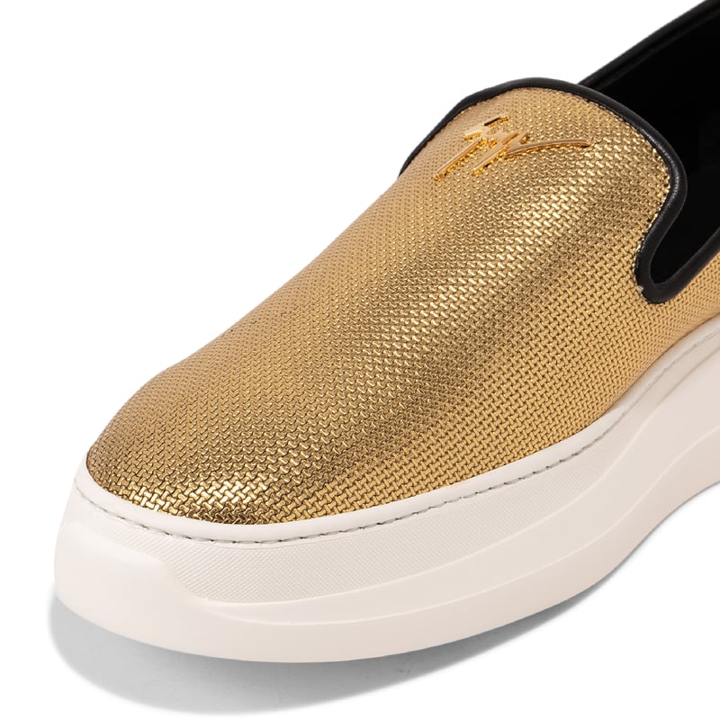 Step out in these Conley sneakers by Giuseppe Zanotti. Featuring golden leather with a laminated texture, these slip-ons exude luxury, elegance and edge. They also feature a rubber sole for comfort and a metal signature on the upper of the shoe.