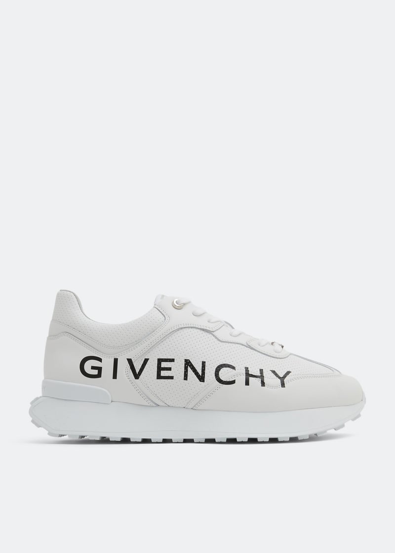 The GIV Runner sneakers from Givenchy feature a vintage style design, a small silver-finish 4G metal buckle on the lacing, a perforated leather top, and a comfortable white thick sole with reinforcements. They are finished with a tonal signature in relief on the heel and bold contrast brand lettering on the side.