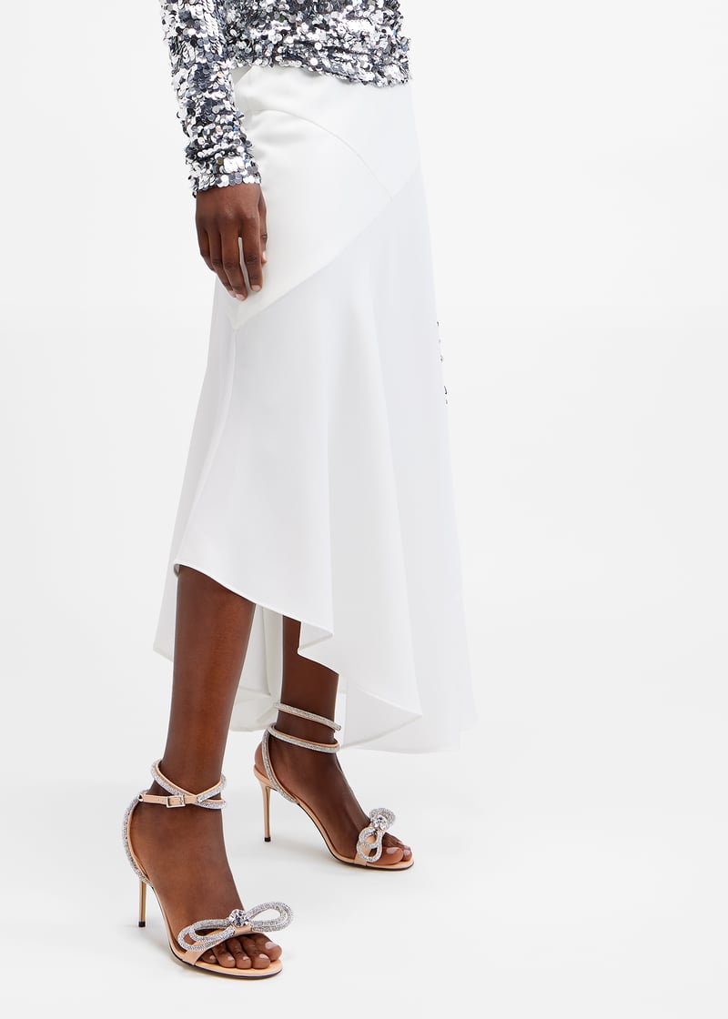 Mach & Mach updates their classic Double Bow sandals with a chic rounded toe! Designed in glossy patent leather, this sparkling pair is elevated by a slim stiletto heel and boasts a crystal-encrusted Double Bow embellishment and a wraparound adjustable ankle strap.