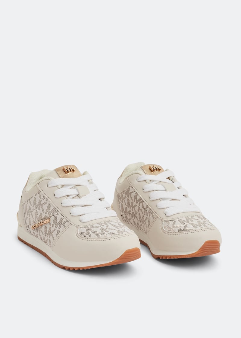 Create an adorable mini-me moment with these Allie Jogger sneakers from Michael Kors. Perfect for weekend activities, they're crafted from smooth and MK-printed leather with metallic inserts, a lace-up closure, rubber sole, and branding details on the side, heel and tongue.