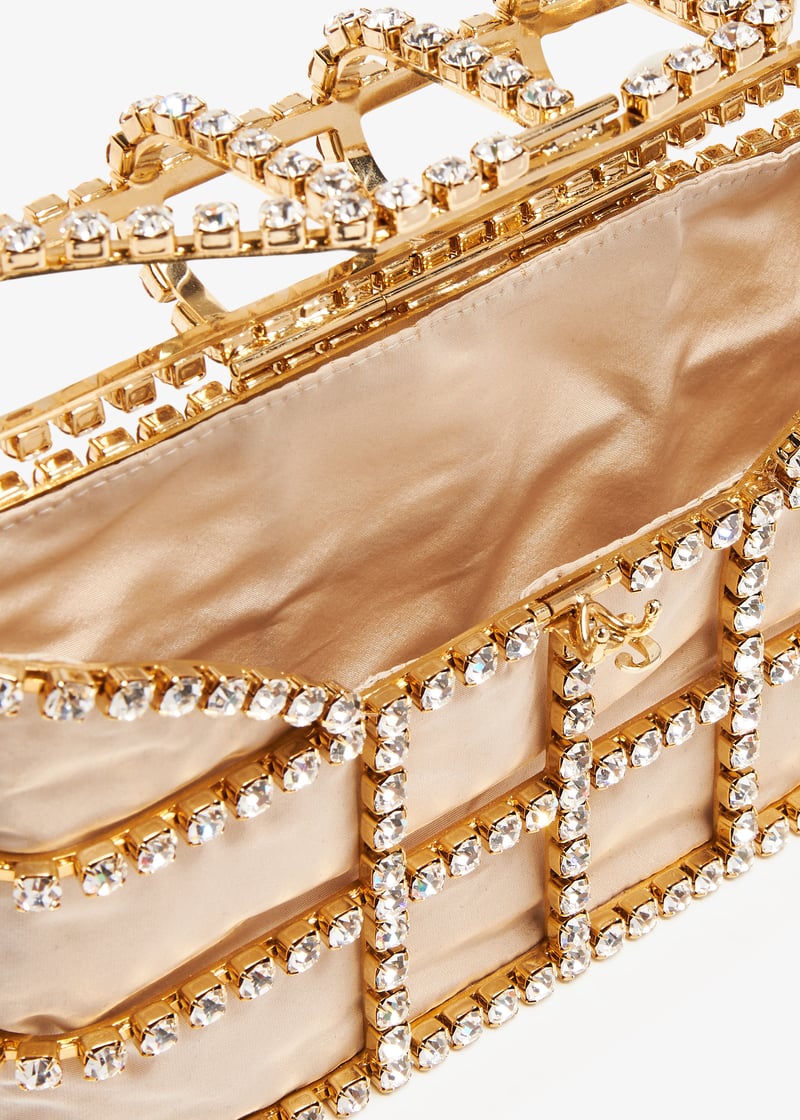 Rosantica's iconic Holli bag now arrives in a sleek, streamlined version. Presented with just as much sparkle as the original, this handmade style features a crystal cage exterior, satin lining, soft pearl top handle, and detachable chain strap.