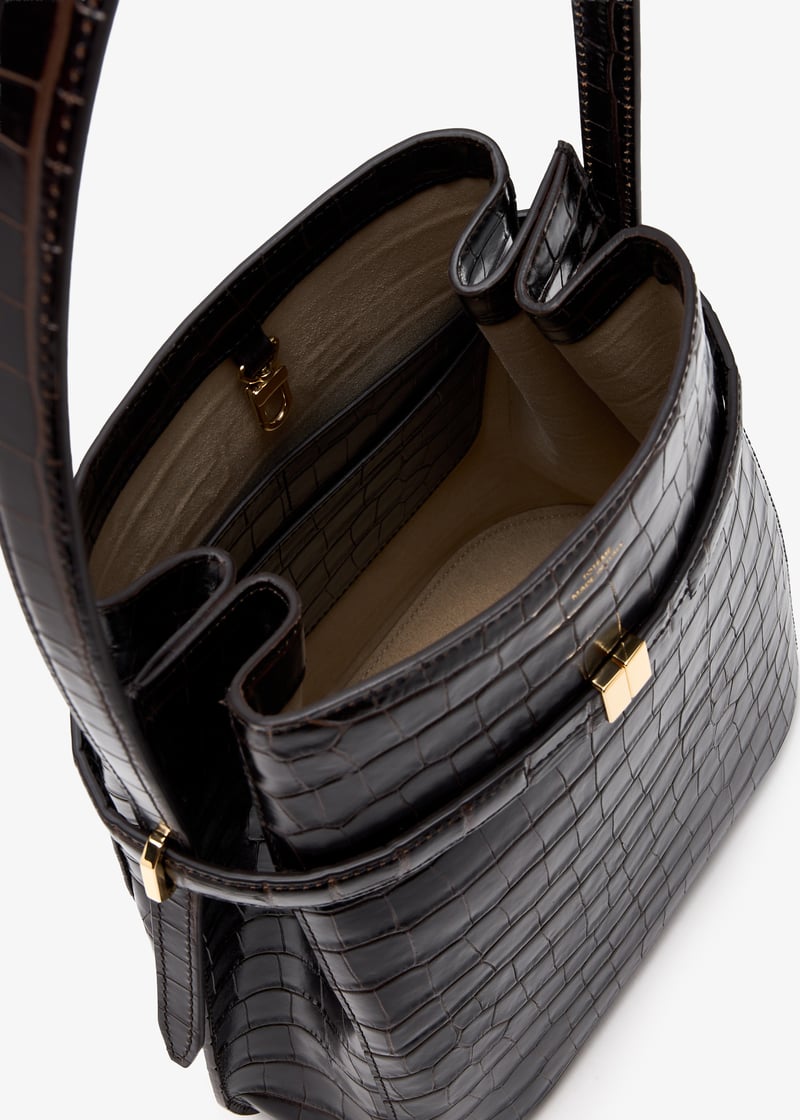 TOTEME knows how to keep it simple yet classy with the Belted croc-embossed bucket bag. Designed with a structured top-handle silhouette, it features gold-toned magnetic hardware and a spacious interior to keep your essentials secure and stylishly in place.
