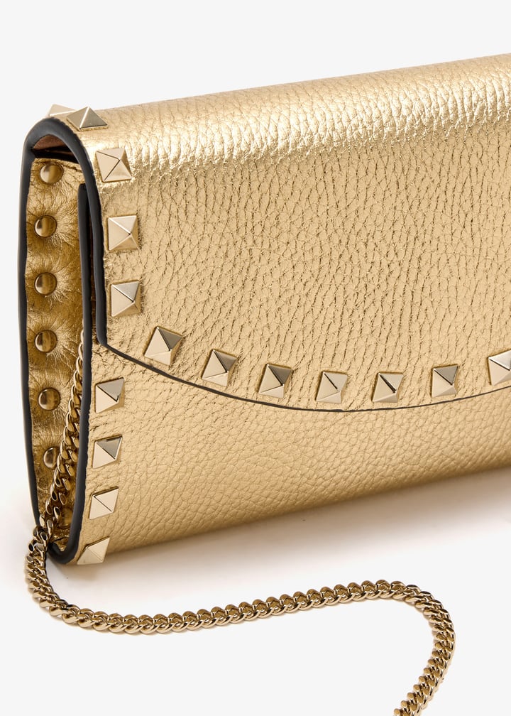 Compact and elegant with an edgy twist, this wallet is crafted in metallic grainy calfskin adorned with the line's iconic platinum-finish studs and finished with inner card slots. This piece can be carried by hand or worn on the shoulder/crossbody with the detachable chain strap.