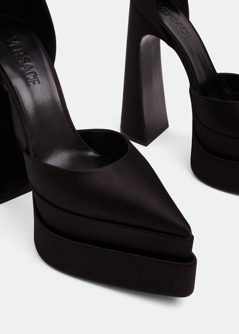 Just when we thought Versace's Aevitas platform pumps couldn't get any better, this sleek, pointed update is introduced for the new season. The satin construction, double platform and crystal-embellished ankle strap remain, whilst an updated curved block heel, V-shaped hardware and Medusa embellishment on the back bring a new energy to this statement-making pair.