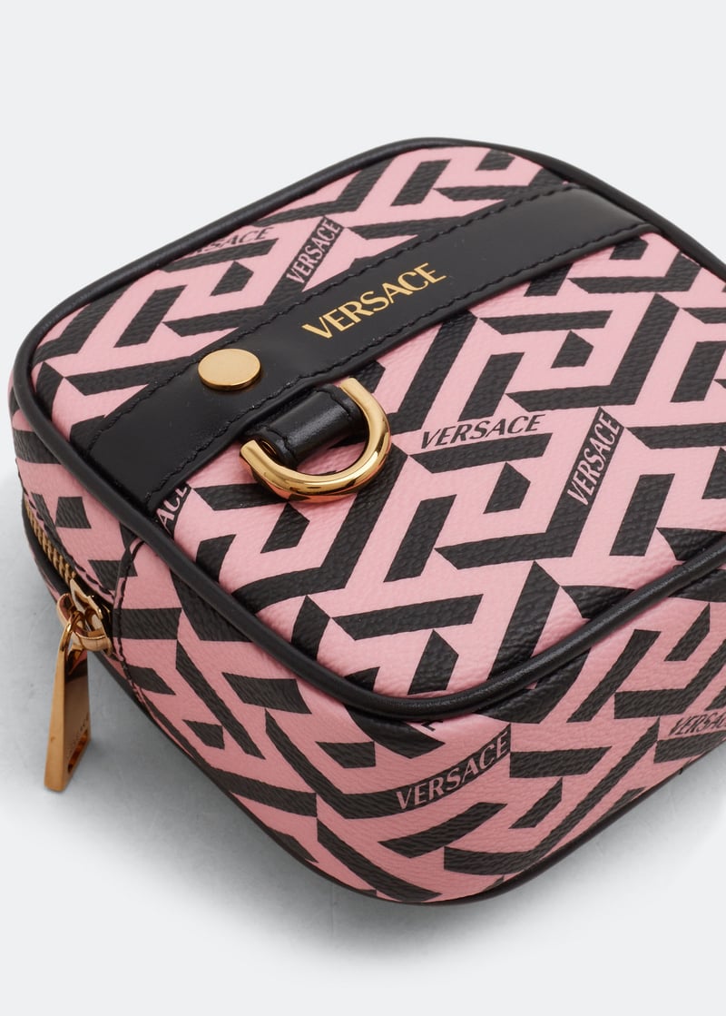 An add-on to your favourite La Greca Signature bag or a place to keep your essentials, this La Greca Signature square modular pouch can be easily attached to a bag, shoulder strap or belt, thanks to its versatility. This Versace accessory is made from La Greca coated canvas in a square design with top zip closure, leather trim and cotton lining. Pouch measures approximately 11cm x 4cm x 11cm.