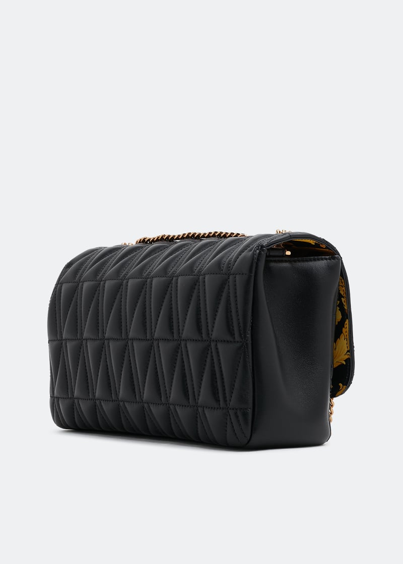 A quintessential bag for the woman of today, the Virtus quilted bag is crafted in premium nappa leather. Versace's baroque 'V' is decorated on the fold-over flap and is complemented with a gold-toned shoulder strap. Bag measures approximately 26cm x 10cm x 15cm.